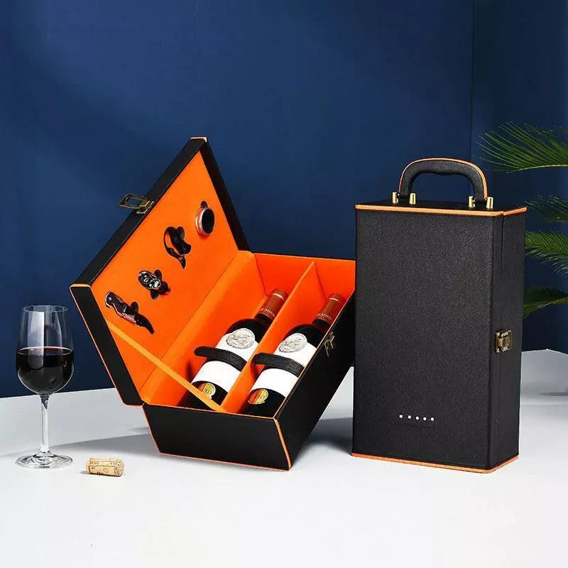 Haben Sie schon einmal von einer magischen Box gehört, die zwei zuverlässige Begleiter für jedes Fest schützt? Entdecken Sie die Deluxe-Weinbox für 2 Flaschen mit Zubehör, deren orangefarbenes Inneres das Herz wie ein Morgensonnenaufgang erhellt. Hätte Wein einen eigenen Superhelden, wäre es zweifellos diese Box. Elegant, robust und voller Seele – bereit, eine Geschichte voller Geschmack und gemeinsamer Momente zu erzählen.