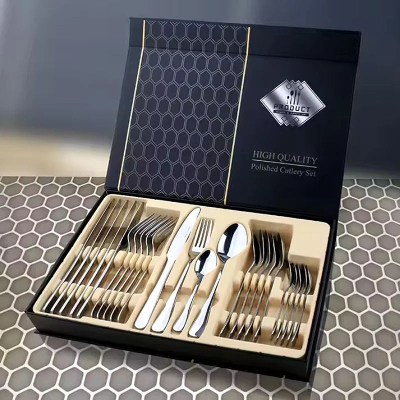 Dieses 24-teilige Besteckset im portugiesischen Stil verleiht jeder Mahlzeit einen Hauch von Raffinesse und Klasse. Es besteht aus hochwertigem Edelstahl und ist korrosionsbeständig, außergewöhnlich langlebig und leicht zu reinigen.