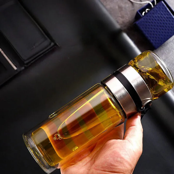 Diese tragbare und hitzebeständige Teeflasche ist die perfekte Lösung für Teeliebhaber, die ständig unterwegs sind oder sich nach dem vollen Brüherlebnis sehnen. Hergestellt aus doppelwandigem Borosilikatglas hält sie die Temperatur Ihres Getränks über längere Zeit – perfekt für Ihre Lieblingstees. Ausgestattet mit einem Edelstahlfilter genießen Sie reine und aromatische Aufgüsse ohne Rückstände. Darüber hinaus dient der Glasdeckel gleichzeitig als Tasse, in die Sie den Tee direkt einschenken können. Eine Silikondichtung sorgt für einen dichten Verschluss und verhindert so unerwünschtes Verschütten. Diese leicht zu tragende Flasche ist ein unverzichtbares Accessoire für jeden Teeliebhaber, der Wert auf Komfort und Qualität legt.