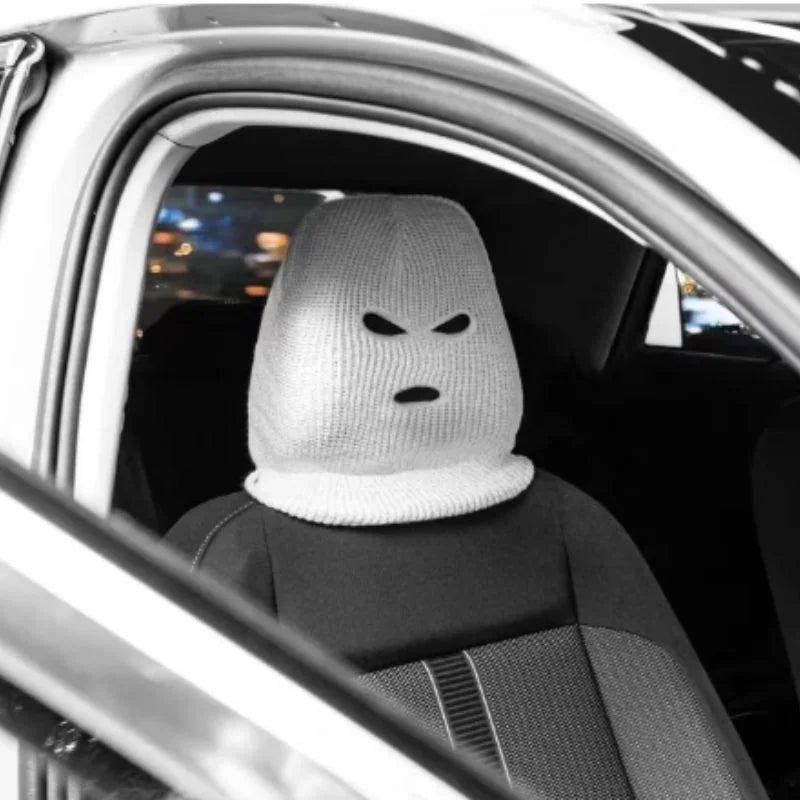 Lustige weiße Sturmhaube für die Kopfstütze im Auto