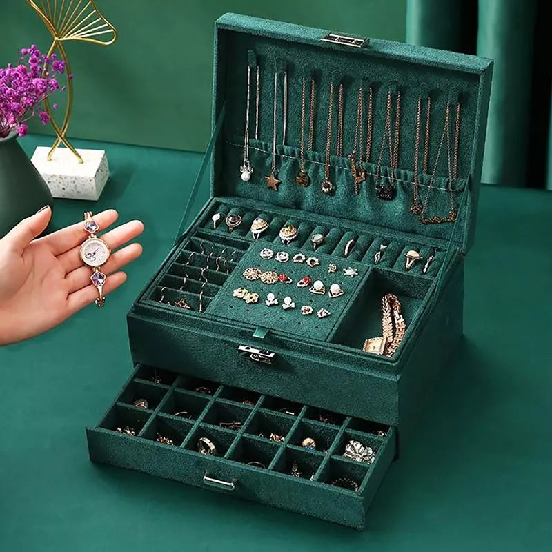 Die Box ist aus hochwertigen Materialien gefertigt und verfügt über einen Schlüssel zur sicheren Aufbewahrung Ihrer Schmuckstücke. Dank mehrerer Fächer können Sie Ringe, Ohrringe, Halsketten, Armbänder und sogar Uhren einfach organisieren. Das luxuriöse Innenleben bietet Schutz vor Kratzern, Staub und Feuchtigkeit.