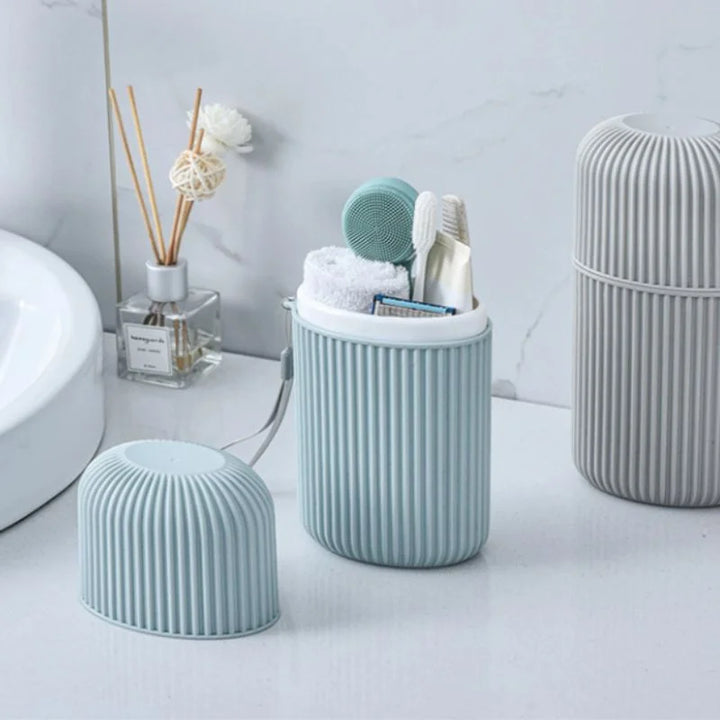Dieser Organizer aus robustem Kunststoff mit stilvoller Rippenoptik ist nicht nur praktisch, sondern auch optisch ansprechend. Er lässt sich leicht öffnen und in zwei Becher verwandeln – perfekt für den Einsatz im Hotelbad, beim Camping oder auf Reisen.